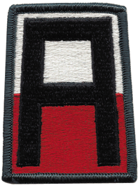 The United States First Army was organized at La Ferte-sous-Jouarre, France, in August of 1918, under the command of General John J. Pershing. The red and white of the background are the colors used in flags for Armies. The letter "A" represents "Army" and is also the first letter of the alphabet suggesting "First Army." A black letter "A" was approved as the authorized insignia by the Commanding General, American Expedition Force, on November 16, 1918 and approved by the War Department on May 27, 1922. The background was added on November 17, 1950.